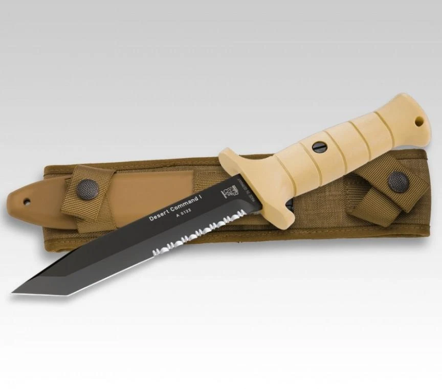 Beidseitig geschliffene Tanto-Klinge aus Böhler N695 Stahl (HRC 57) mit schwarzer Kalgard-Beschichtung und partiellem Wellenschliff. Glasfaserverstärkter Kunststoffgriff.
