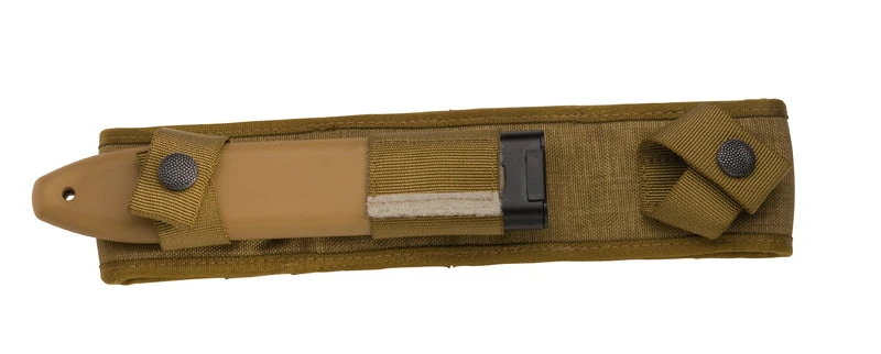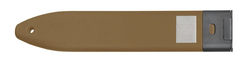 Die Coyote-farbene Kunststoffscheide mit Gurtband passt für alle U.S.-M.O.L.L.E.- und IDZ-Tragesysteme der Bundeswehr. Mit Diamant-Nachschärfplatte.
