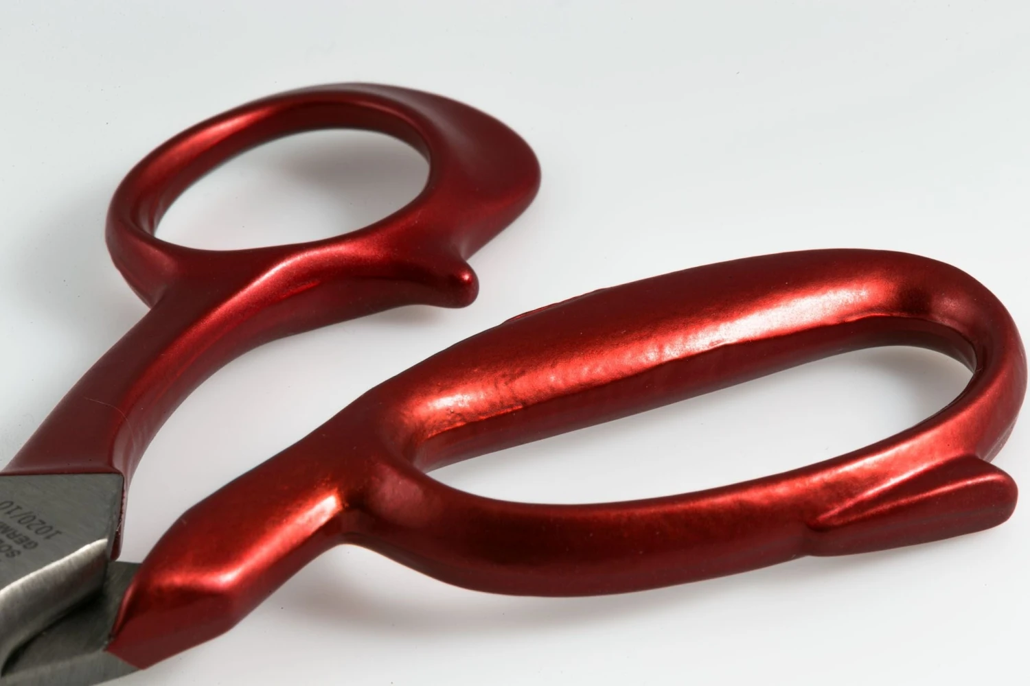 Pulverbeschichtete Griffe sind für geschmiedete Scheren eine echte Neuentwicklung und ein technischer Fortschritt gegenüber der traditionellen Nasslackierung. Die rote, griffige Pulverbeschichtung charakterisiert die Scheren für technische Textilien:
